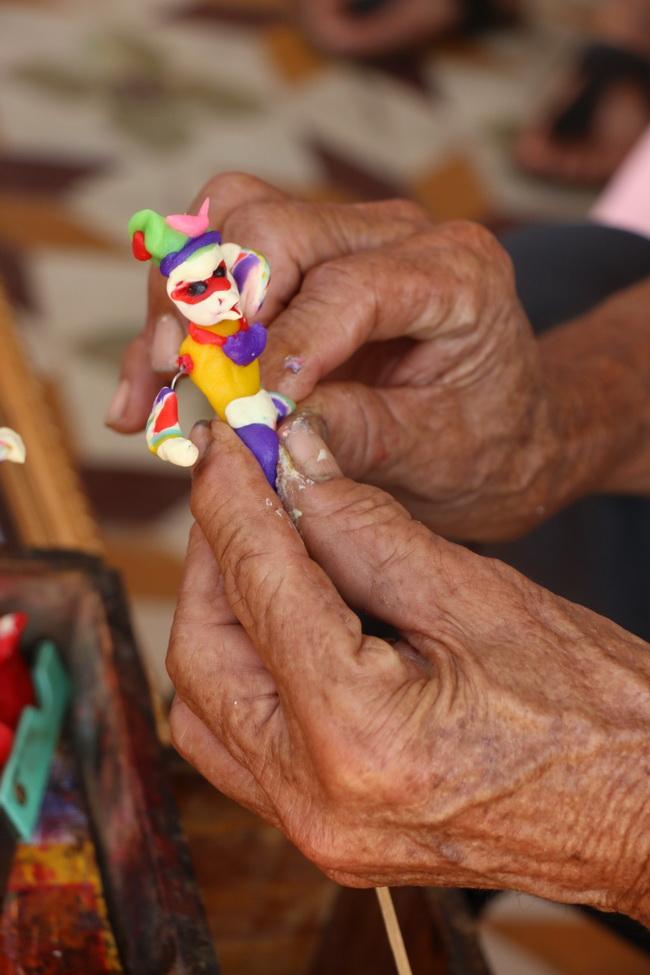7月27日,指尖闽南团队成员来到永宁镇拜访妆糕人传承人雷远洲。雷先生已八十一岁,但仍精神矍铄,手中熟练地捏出一个又一个俏皮可爱的糕人。“妆糕人”源于中原地区的“捏面人”,也是大多数闽南人儿时最期待的街头表演。“妆糕人”是以大米粉、糯米粉、调色素、蜡油为原料,通过水浸、微蒸后配制成泥,再采用多种捏制手法而成。在物质匮乏的年代,雷远洲曾骑自行车一路北上沿途制售妆糕人,走遍大半个中国。如今老人为留存技艺,让儿女们都学习制作,外孙小高还为妆糕人注入了时尚元素,如叮当猫、喜羊羊等。老人一边捏一边语重心长地说,一技在手,走遍天下不愁。如今,在庙会或佛诞时候,他仍会到人多热闹的地方捏几个“妆糕人”。