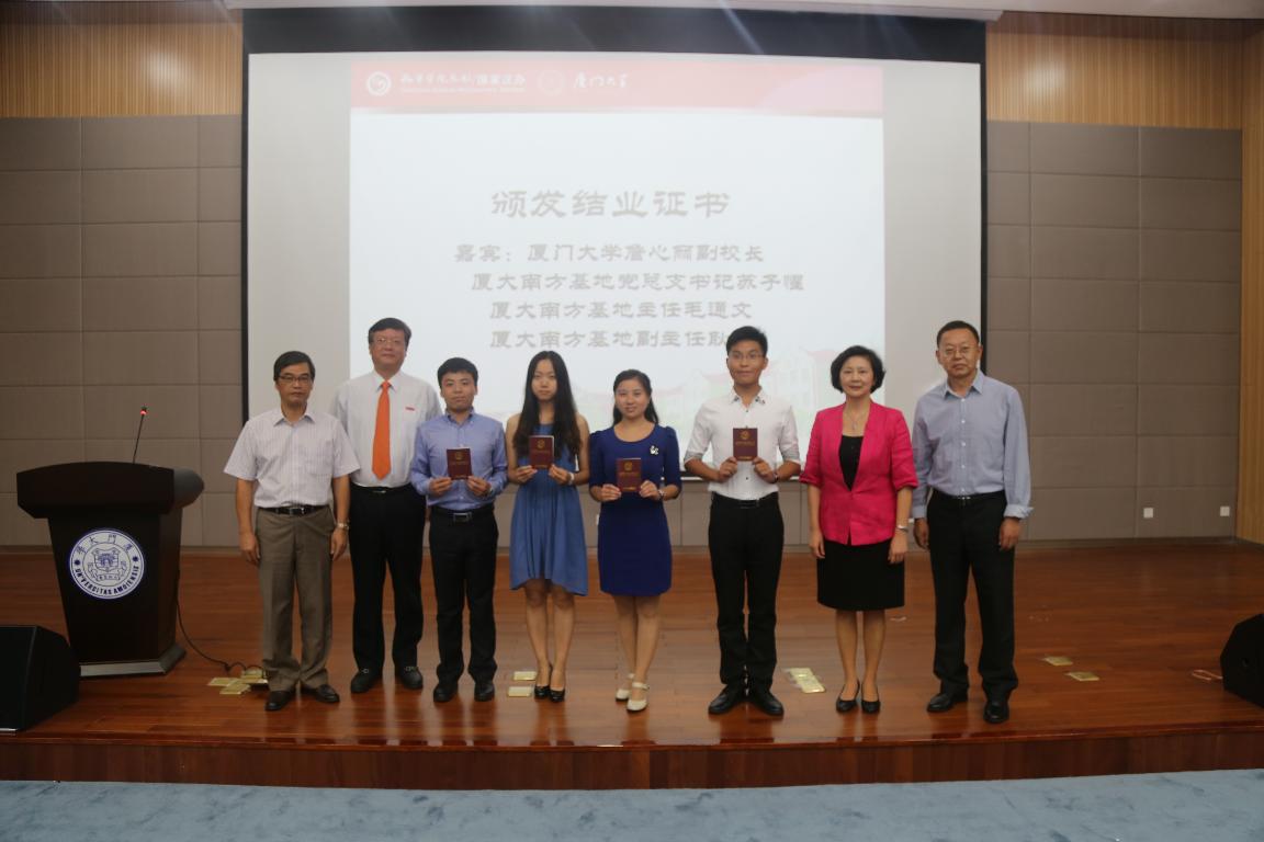 詹心丽、苏子惺、毛通文和耿虎一起为代表颁发结业证书,和大家共同分享成功的喜悦,并告诫每一位学员在国外要继续坚守汉语国际推广的使命,真正做到矢志不渝,勇敢地担当起推广汉语、传播中国文化的神圣使命,走好自己无悔人生的坚实步伐。