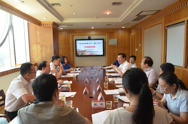 6月26日上午,广东外语外贸大学党委书记隋广军、副校长阳爱民,广东国际战略研究院、21世纪海上丝绸之路协同创新中心负责人来校交流座谈,共同探讨合作建设21世纪海上丝绸之路协同创新中心(以下简称“中心”)有关事宜。校党委副书记、副校长李建发,社科处、南洋研究院、人文学院、南海研究院等相关部门负责人参加座谈。