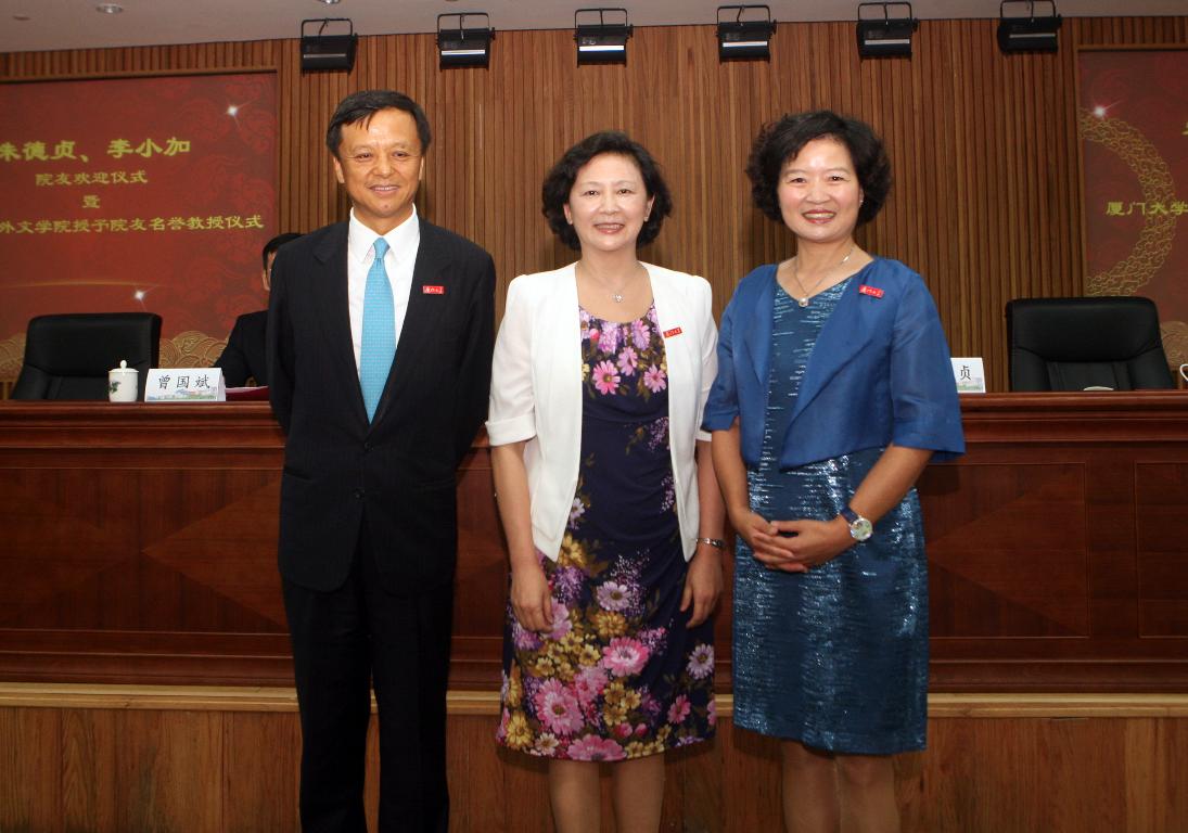 6月25日下午,我校1977级外文系校友、上海国和现代服务产业股权投资管理有限公司总裁朱德贞,1980级外文系校友、香港交易及结算所有限公司集团行政总裁李小加正式受聘成为我校外文学院名誉教授。副校长、校友总会副理事长詹心丽为朱德贞女士和李小加先生佩戴厦门大学校徽,外文学院院长张龙海向他们颁发名誉教授聘书。外文学院党委书记陈志伟主持敦聘仪式。