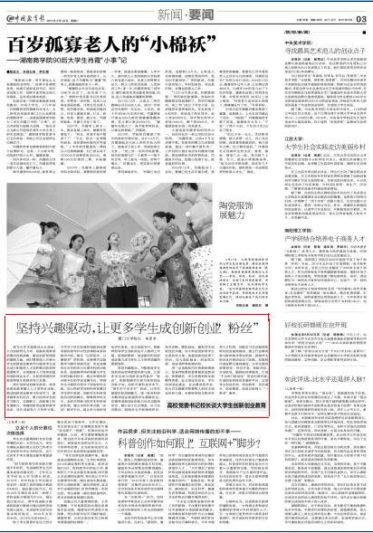 6月23日出版的《中国教育报》第03版《新闻要闻》版的“高校党委书记校长谈大学生创新创业教育”栏目刊发我校校长朱崇实文章,题目是《坚持兴趣驱动,让更多学生成创新创业“粉丝”》。