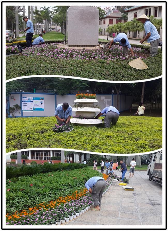 为保障此次校园开放日活动顺利举行,根据学校的工作布置,后勤人早在一周前就投入到了准备工作中,保证以整洁、优美的校园环境迎接高考毕业生和家长们:提前对开放日主会场建南大礼堂及周边环境进行整治,并对校园各垃圾点的杂物进行清理;加班加点地清洗校园内所有的果皮箱内胆及外壳、底座;在开放日之前完成了对校园所有雨、污井及沟的消杀工作;对校园主干道的树木进行修整,累计外运树尾巴十余车;清理学生宿舍、教工住宅区等的废弃物,累计清运25车;对校园环境进行美化布置,在建南大礼堂、陈嘉庚铜像、群贤校门周边种植、摆放长春花、太阳花等一万余盆……