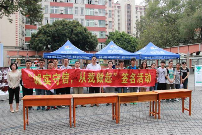 活动现场,三家村广场上设置了留言板,让来往同学们在便利贴上留下自己对“诚实守信”主题的观点和感悟;同时安排了给同学们签名的“诚实守信,从我做起”横幅和印手掌印的“诚信之树”画布,还有以消暑物品和零食为奖品的抽奖活动等。