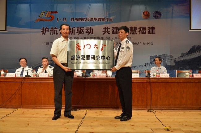 5月15日,由福建省公安厅经济犯罪侦查总队、厦门市公安局、厦门大学法学院联合主办的 “厦门大学经济犯罪研究中心”授牌仪式暨“知识产权刑法保护”研讨会在我校科学艺术中心举行。此次研讨会既是配合本年度“5·15”经侦宣传日的主题活动,也是厦大法学院、知识产权研究院、经济犯罪研究中心与厦门市公安局开展长期合作的良好开局。公安部经侦总局副局长刘冬,福建省公安厅巡视员蔡小林,厦门市公安局副局长邓海鹰以及我校党委副书记、纪委书记赖虹凯出席仪式并致辞。来自公安部、省公安厅、市公安局、厦门大学以及协办企业的各级领导代表共300余人参加仪式。