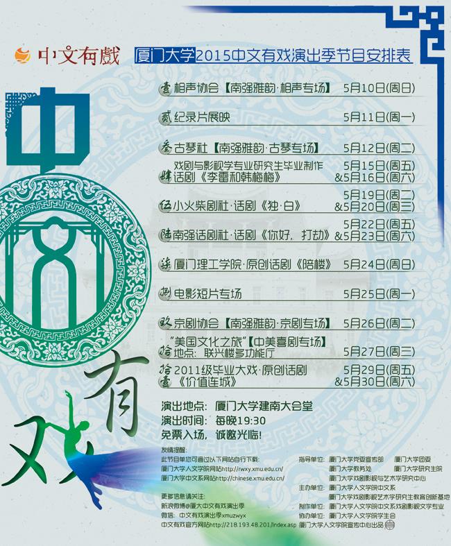 据悉,厦门大学“中文有戏”演出季自2010年5月举办以来,在厦大校园和社会上掀起了一股“看戏、赏戏、评戏”的热潮,已成为厦门大学一年一度的文化盛事,是目前中国高校校园中同一剧场连续演出历时最长、两岸戏剧戏曲学专业师生合作最为密切,囊括话剧、戏曲、电影等多种艺术形式的校园大型演出季。本次演出季将持续至5月30日,接下来还会有纪录片展映、古琴专场、京剧专场、毕业大戏等精彩节目在建南大会堂上演。