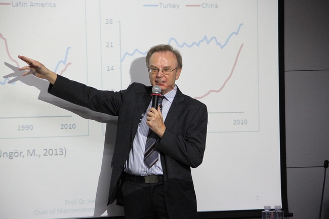 5月3日至10日,德国哈根大学宏观管理研究所所长、宏观经济学系主任Helmut Wagner教授应邀造访教育部人文社会科学重点研究基地——厦门大学宏观经济研究中心,展开为期一周的访问、交流。访问期间,Wagner教授除探讨与宏观经济研究中心开展学术合作外,还借中心Seminar的机会,为经济学院师生开设了宏观经济系列讲座,主题涉及结构改变及中等收入陷阱、区域经济分化与欧元区前景、房地产和资产泡沫。