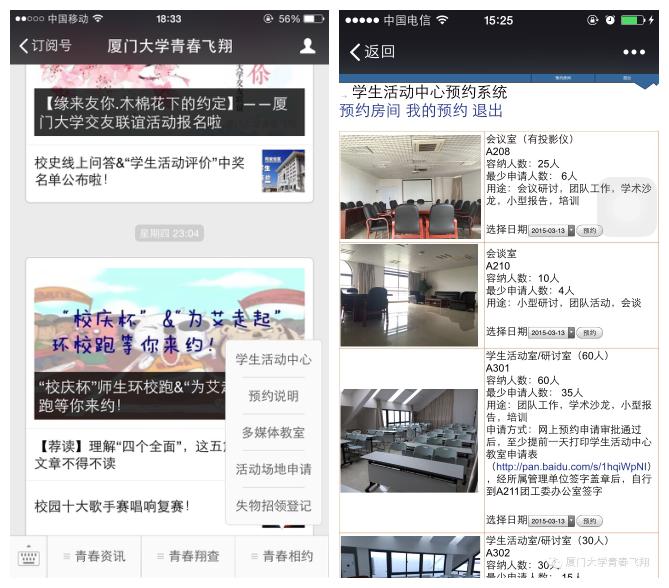 经过上一学期的摸索,学生活动中心活动室的服务与管理职能得到了实践的检验与提升,今年3月16日,翔安校区学生活动中心活动室微信预约系统正式上线,并带来了一些富有意义的改变。一方面,微信预约系统的上线实现了学生服务中心的无纸化办公。根据上一学期使用情况估计,一学期至少可以节约600张作为申请表的A4纸!实践了全社会倡导的环保理念。另一方面,微信预约系统简化了申请借用流程,各预约单位只需关注翔安校区团工委官方微信(厦门大学青春飞翔),点击菜单栏“青春相约”中的“学生活动中心”,如实完整地登记相关信息,即可申请使用活动室。