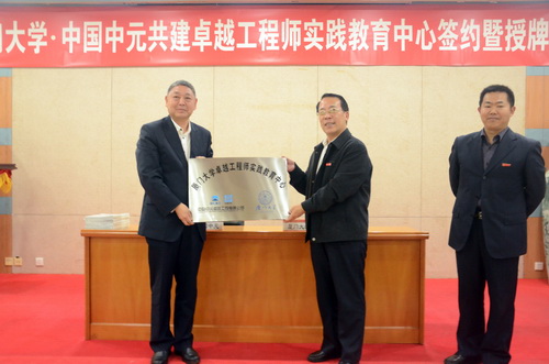 4月8日下午,厦门大学与中国中元国际工程有限公司共建卓越工程师实践教育中心签约暨授牌仪式在厦门大学颂恩楼隆重举行。邬大光副校长与中国中元董事长、总裁丁建在协议书上签字。厦门大学校长助理张建霖、中国中元总建筑师谷建、副总建筑师陈自明、人力资源部部长耿向京、中元(厦门)院院长洪峰、副院长涂斌,现代教育技术与实践训练中心主任、教务处副处长谢火木,学生处副处长刘艳杰、科技处副处长曾景华、研究生院综合办副主任罗春霞以及厦门大学建筑与土木工程学院党政领导和师生代表参加仪式。签约仪式由厦门大学建筑与土木工程学院院长王绍森主持。