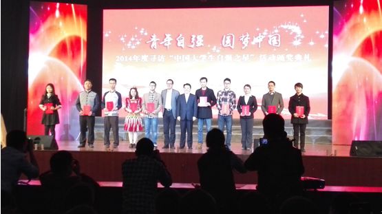 3月21日,2014年度寻访“中国大学生自强之星”活动颁奖典礼在东南大学举行,我校外文学院2012级英语专业本科生孙妍珊同学荣获“中国大学生自强之星标兵”,团中央书记处书记傅振邦为孙妍珊颁发荣誉证书。
