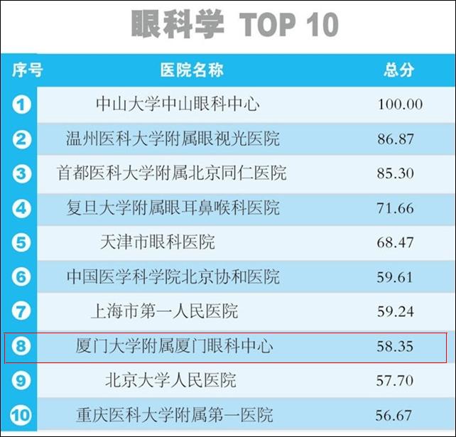 近日,中国医学科学院医学信息研究所联合医学科学报社共同发布了“2014年度中国医院科技影响力排行榜”。厦门大学附属厦门眼科中心以58.35分位列眼科学排行榜第八位,是福建省唯一入选的眼科学专科,也是所有医学学科中福建省唯一进入全国前十名的学科。