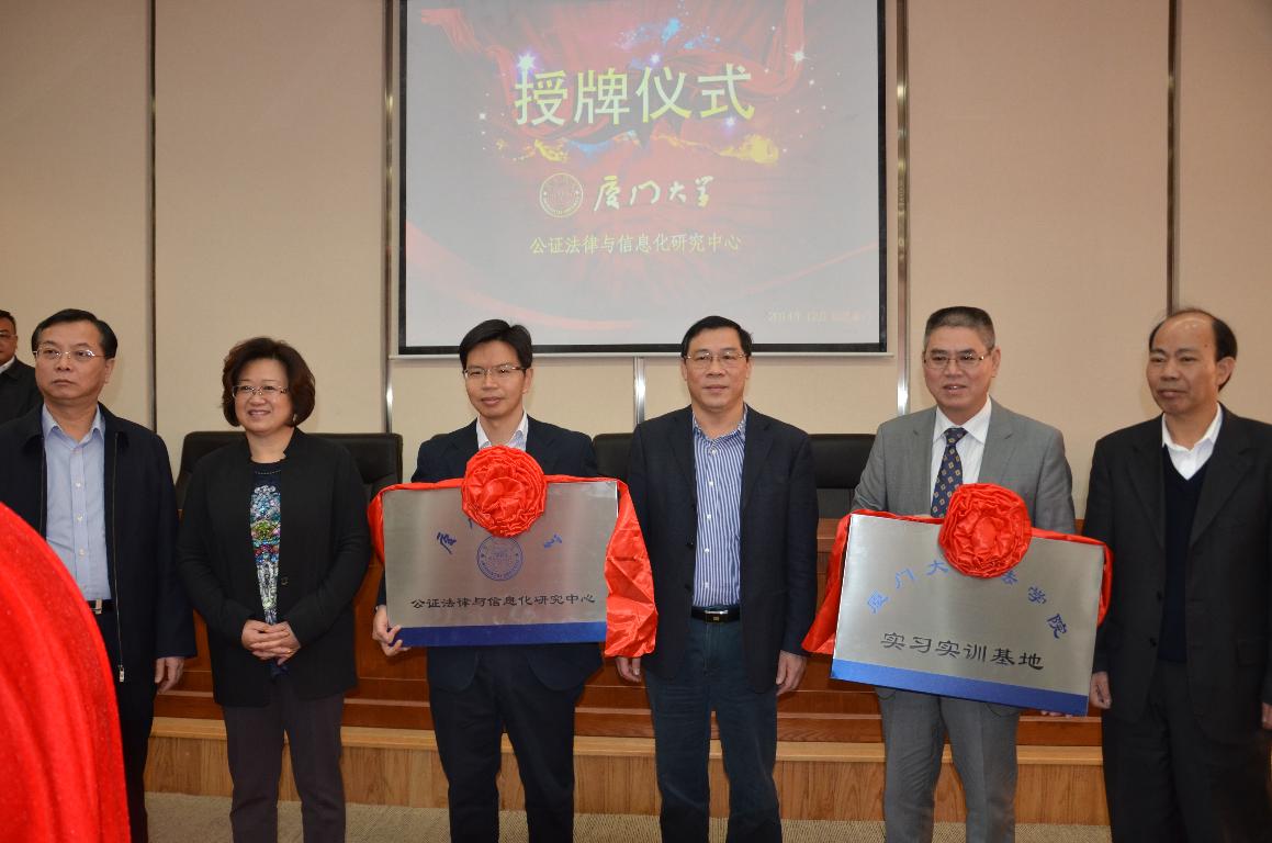 12月17日上午,厦门大学公证法律与信息化研究中心授牌仪式(以下简称“研究中心”)在科艺中心举行,同时,作为研究中心成果之一的鹭江公证处在线公证平台举行了上线仪式。校党委副书记、副校长李建发,中国公证协会会长丁露,福建省司法厅副厅长王敏夫,厦门市司法局党组书记、局长叶勇义为研究中心授牌,研究中心主要负责人刘志云接牌,研究中心理事长、鹭江公证处主任苏国强,中国公证协会领导、专家,省市司法系统、公证行业负责人等共同见证。
