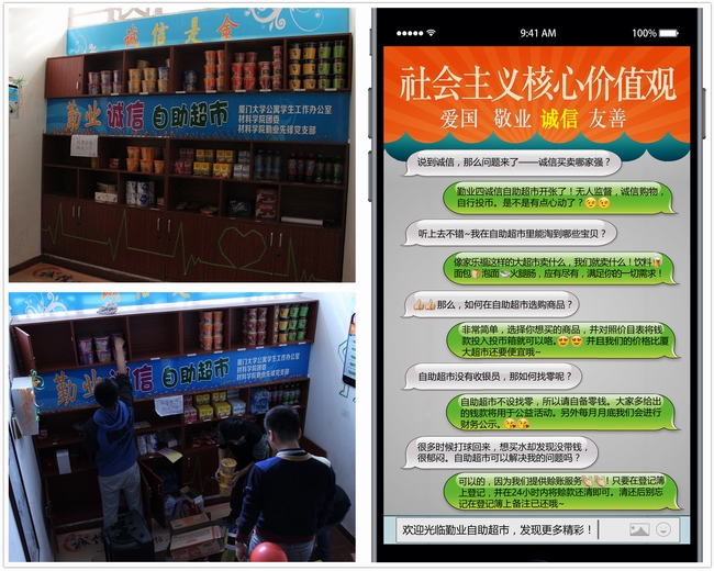 学生宿舍是高校育人工作的重要阵地。为进一步带领广大同学践行社会主义核心价值观,提高诚信意识,贴心服务同学,实现公寓文化育人,在公寓学生公寓办公室、材料学院党委的指导下,院团委、勤业学生公寓先锋党支部、公寓团支部和学生宿委会联合成立了校内首家依托公寓建设的大学生“诚信自助超市”。所谓“诚信自助购物”,就是所有商品无人看顾,买者只需主动将货款放入付款箱,自备零钱、自选商品的一种购物形式,这种购物形式也见证着购物人诚信的力量。