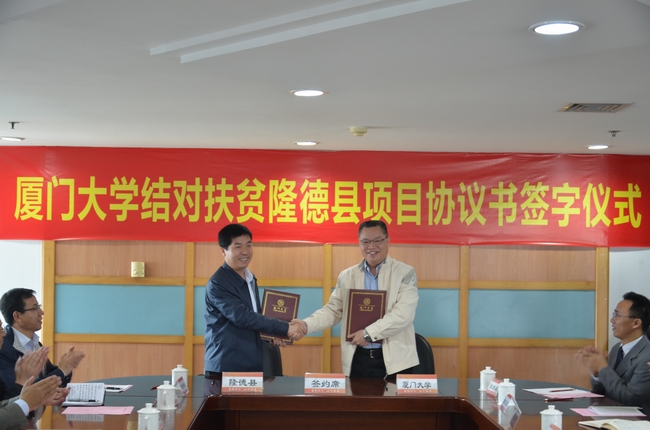 叶世满表示,2012年底,国务院扶贫办确定我校与隆德县对口帮扶关系,这是中央赋予厦门大学的光荣任务,也是学校义不容辞的社会责任。两年来,学校与隆德县联系紧密,根据实际情况制定帮扶规划和实施方案,确定落实帮扶项目,在相互沟通中探索出高校结对扶贫的有效方法。今天,我们签订结对扶贫项目协议书,是对帮扶项目的进一步明确与落实。今后,厦大将继续发挥学校人才、科技等优势,结合当地发展需求和特色,更有针对性地在人才培养、生态旅游、生态农业等方面给予更多支持,深入推动校县合作,实现共赢。