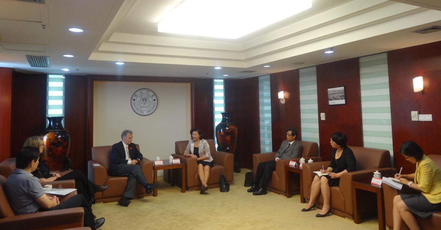 詹心丽副校长首先对David Gauthier副校长的再次到访表示欢迎。接着双方回顾了自共建孔子学院运行以来及David副校长去年率团来访后近一年里两校的合作进展。David副校长表示,依托共建孔子学院,圣玛丽大学与当地政府的联系日益密切;当地也希望能通过孔院的桥梁和纽带作用,在教育和经贸往来上深化合作。同时,David副校长也表达了对厦门大学的感谢,感谢厦门大学能选派出优秀的中方人员支持开展工作,以及对来华暑期培训班等项目学员的周到接待。双方表示今后应继续利用共建孔子学院进一步加大合作力度,尤其是扩大两校师生的互派互访。就此,詹心丽副校长还就各类针对外国学生设立的奖学金奖项内容进行了介绍。会谈中David副校长还代表圣玛丽大学校方表达了2015年续签孔院协议及邀请我校领导率团再次访问圣玛丽大学的愿望。
