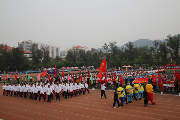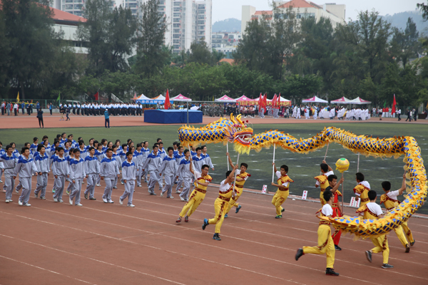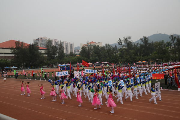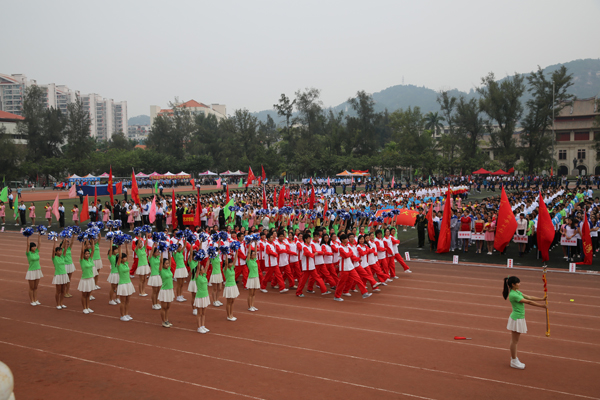 八时整,入场式正式开始。在国旗队的引领下,花束队、彩旗队、老年人体育协会代表队依次入场。各学院代表队紧随其后。管理学院青春学子簇拥着蓝色巨龙健步走来,两边列队如同振动的双翅,蓬勃有力;艺术学院用轻快的舞姿、悦动的音符诠释体育与艺术的融合之美,吉祥物音音和美美更是将海浪与凤凰花的元素融入其中,尽显活泼、可爱;建筑与土木工程学院将口号印于伞面,在灵动旋飞中,洋溢着青春的活力;公共卫生学院高举“膳食金字塔”拼图,传递他们“吃动两平衡”的健康生活理念;……他们个个昂首阔步、精神抖擞,整齐划一的步伐、昂扬青春的笑脸,铿锵有力的口号无不在展现出青春学子的神采奕奕和朝气活力。