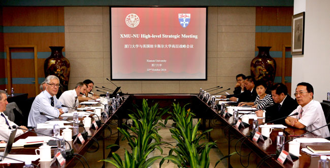 22日,两校召开了高层战略会议,我校校长朱崇实、副校长邬大光、叶世满等出席。会议介绍了该学院首批拟设立的国际商务管理、城市规划和药学三个专业的申报进展,介绍了七个科研平台的基金申请情况,以及目前学院成立申报材料的准备进展,提出了筹备过程中遇到的困难和问题。双方讨论了学院的运营模式、人才政策和薪资政策,以及厦门大学和纽卡斯尔大学合作协议和章程。双方进行了良好的沟通并达成广泛共识。