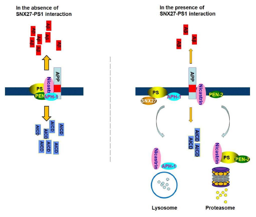 SNX27在γ-分泌酶形成和Aβ产生过程中的调控作用模式图