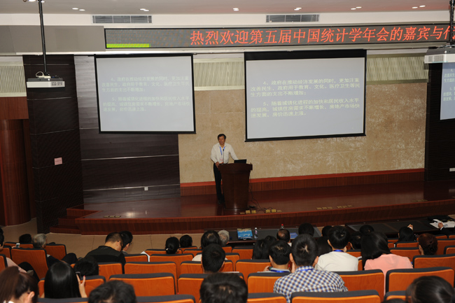 本届年会邀请了许宪春教授、崔恒建教授、肖红叶教授、邱东教授、WolfgangHärdle教授、民生证券首席经济学家邱晓华教授、金勇进教授、谢邦昌教授、曾五一教授等九位统计学家(学者)作特邀报告。许宪春教授在题为《中国国民经济核算体系的修订及其意义》的报告中,对为什么要对现行国民经济核算体系进行修订、中国国民经济核算体系修订的重点内容以及中国国民经济核算体系修订的意义分别进行了详细的阐述。崔恒建教授在题为“Partial Penalized Likelihood Ratio Test for Sparse Case”演讲中,强调在大数据时代下,数据维数高并具有稀疏性,所以处理大数据时要特别抓住其高维、稀疏的特点,提出惩罚似然可以从原来的全惩罚修改为有选择的进行惩罚。肖红叶教授以《社会经济大数据信息的最优采集与有效使用问题研究》为题,围绕社会经济已进入大数据时代、对大数据的认知、经济主体市场行为信息决定的相关研究等进行演讲。邱东教授在题为《经济测度的可加性问题》的演讲中,主要探讨了实物、价值以及合成人类三大指标加总方式以及经济社会测试中的“可加性问题”,指标口径、价格信号、“当量转换”等,并得出了关乎指标可靠性的结论:“计量须较质”。Wolfgang Härdle教授发表了题为“TEDRIS-Tail Event Driven Risk Structures”的报告,具体介绍了尾事件的七个不同项目及技术处理细节。邱晓华教授在题为《新常态、新视野、新趋势――中国经济分析与展望》的演讲中表示,中国经济告别了两位数高速增长,进入一位数中高速增长,增长趋势并没有完全逆转,经济还有一定的增长惯性,经济增速不会断崖式下滑。金勇进教授在题为《我国企业创新调查抽样方案设计》的报告中,围绕“调查背景”、“精度与样本量”、“样本量分配”、“样本抽取”、“样本追加”、“关于估计”等六个方面进行阐述。谢邦昌教授在题为《云计算在大数据时代统计研究发展重要性》的演讲中,介绍了大数据发展的现况与未来发展趋势,以及大数据带来结构性变革。曾五一教授在题为《关于统计学专业教学质量国家标准的若干问题》的报告中,介绍了制订教学质量国家标准的意义、进展情况以及主要内容等。