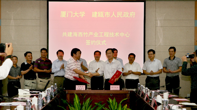 10月17日,厦门大学与建瓯市人民政府共建海西竹产业工程技术中心签约仪式在颂恩楼215会议室隆重举行。建瓯市委副书记林飞,我校校长助理滕伯刚代表双方签订战略合作协议,南平市政协副主席王易风、建瓯市委书记余建坤、我校校长朱崇实共同见证签约仪式并致辞。