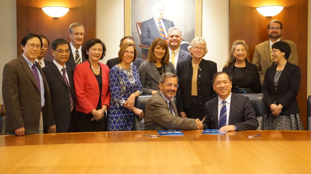 26日早晨,代表团一行来到美国,对特拉华大学进行友好访问。当天下午参观特拉华大学高新技术创业园区后,双方在特拉华大学行政楼举行了两校“博士培养计划”协议的签约仪式,由杨振斌书记与Grasso教务长共同签署。詹心丽副校长、苏子惺、黄琛和特拉华大学副教务长Nancy Brickhous及校院高层共同见证了协议的签署。根据协议,特拉华大学将在未来的五年里接受我校推荐的优秀学生到该校攻读博士学位,学生毕业以后将成为我校国际化师资的重要来源。Grasso教授对杨书记一行的到来表示热烈欢迎,并对协议得以顺利签署表示衷心的感谢,表示今后将尽心尽力为厦门大学培养最优秀的人才。杨书记表示,“特拉华大学与厦大之间有着多年的良好合作关系,在多个学科领域都有着实质性的合作,双方的交流互访也越来越频繁,相信双方建立在互信共赢基础上的合作之花一定会不断结出多彩的硕果”。
