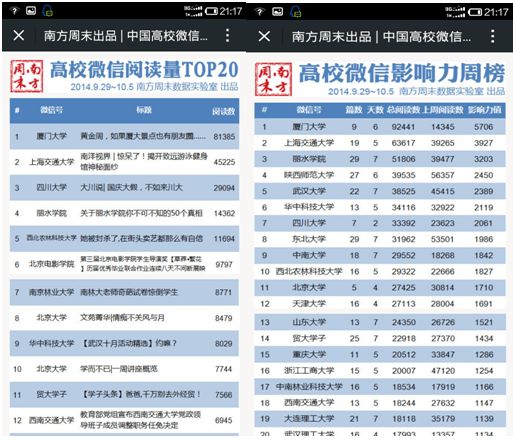 《南方周末》每周收集全国各大高校微信推送的后台反馈数据,以真实的数据反映各大高校微信平台推送文章的质量和受欢迎程度。数据的背后,是高校之间文化软实力的PK,更是广大网友对各大高校文化魅力的认可和拥趸。