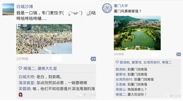 厦大官方微信平台于10月4日推送的《黄金周,如果厦大景点也有朋友圈……》一文,以诙谐生动的语言,活泼新颖的形式,寓意丰富的内容,引发许多厦大人的集体共鸣,获得众多网友的点赞转发。文章推送后阅读量全线飘红,两个小时内阅读量破20000,次日阅读量直抵70000。该文巧妙设计了行文形式,赋予上弦场、白城、芙蓉湖、嘉庚楼群、芙蓉隧道等厦大著名景点人格化的形象,将各景点的标志性特征以软文的形式嵌入其中,通过各景点之间的朋友圈互动,幽默调侃,将厦大人熟悉的黄金周现象生动呈现。截止10月9日,该篇文章的点击阅读量达84498,共计666人点赞,5014人转发。
