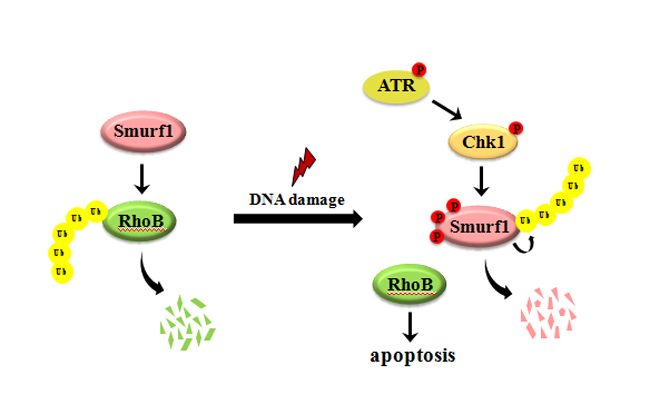 Rho家族小分子G蛋白是细胞内重要的调控分子,它们作为分子开关,参与调控了细胞内众多的生理生化过程。RhoA、RhoB和RhoC是这个家族中同源性很高的三个成员,其氨基酸序列的一致性高达85%。然而,尽管三者在调控细胞骨架的形成中都起着重要的作用,但是它们在调节许多其它的细胞生物学功能中的作用不尽相同。与相对稳定的RhoA、RhoC蛋白分子不同,RhoB特异性的参与DNA损伤引起的细胞凋亡来抑制肿瘤生长,而作为一个在细胞内会被很快的泛素化降解的短寿蛋白,负责调控其蛋白稳定性的E3泛素连接酶尚不清楚。王洪睿课题组发现了HECT家族的E3泛素连接酶Smurf1可以通过介导RhoB的泛素化降解来调控RhoB的蛋白水平,并在DNA损伤所引起的细胞凋亡中起着重要的决定作用。紫外照射或烷基化试剂处理导致的单链DNA损伤激活ATR/Chk1信号通路,激活的Chk1通过磷酸化Smurf1加速其自身泛素化降解,使得RhoB的蛋白水平显著提高,从而促进了细胞的凋亡。同时,该研究指出了Smurf1在肿瘤中高表达可能会导致RhoB的过度泛素化降解,进而在肿瘤的发生过程中起着重要的作用。