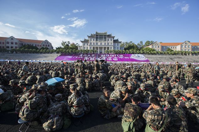 上弦场,明末郑成功操练水师之地,如今汇聚成一片迷彩的汪洋之带。校党委副书记、我校军训工作领导小组组长林东伟,学生处处长、军训工作领导小组副组长、军训团政委夏侯建兵,校党委宣传部部长徐进功及军训工作领导小组成员来到千人博饼现场,为2014级学生军训团博饼活动拉开序幕。