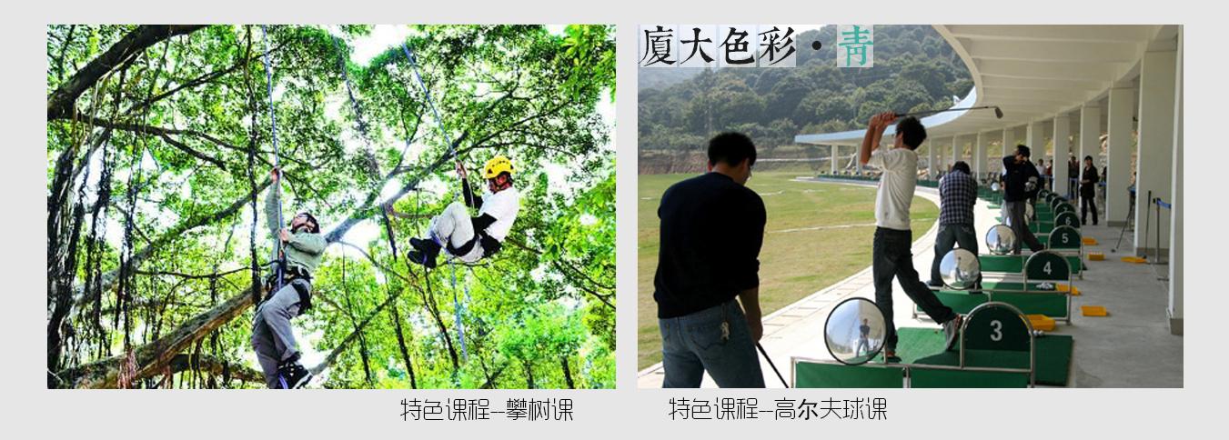 面朝大海,春暖花开;依山傍水,跨海而建……厦大之美,小夏已无需赘述。但厦大的美绝不是华而不实的存在。在课程设置上,厦大利用自己特殊的优势,因地制宜、别具一格地开设了令众多小伙伴们“手之舞之、足之蹈之”的——高尔夫球课、爬树课、潜水课等特色课程。若是想亲身体验一番?那请风驰电掣、健步如飞、眼疾手快地拼人品选课报名吧!