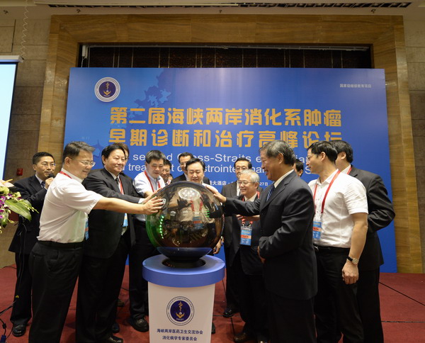 近年来,恶性肿瘤已逐渐成为严重威胁我国人民生命健康的疾病,消化系恶性肿瘤是我国最为高发的肿瘤,占全部恶性肿瘤的60%左右。为此,2013年7月召开的第一届“海峡两岸消化系肿瘤早期诊断和治疗高峰论坛”已成立了“海峡两岸消化系肿瘤早期诊断和治疗基地”,搭建起两岸四地消化系肿瘤早诊早治学组的交流合作平台。随着第二届“海峡两岸消化系肿瘤早期诊断和治疗高峰论坛”的圆满召开和“海峡消化中华行”的正式启动,海峡两岸四地的消化界专家组将赴南京、重庆、长沙、西安城市巡回推动消化系统肿瘤早期诊断和治疗,以提高我国早期消化道肿瘤的诊断率,为海峡两岸人民健康事业做出更大的贡献。
