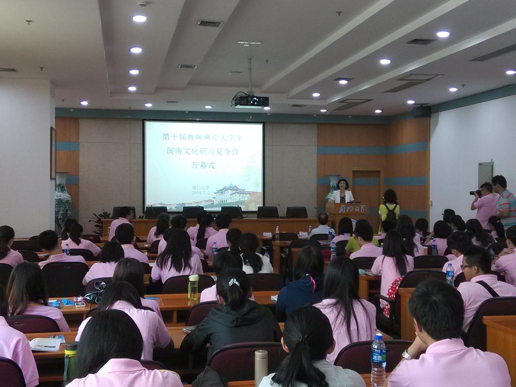 7月2日上午,2014年第十届海峡两岸大学生“闽南文化研习”夏令营在我校开幕。来自台湾地区各知名高校的师生和我校师生一起开启了为期10天的闽南文化之旅。我校副校长詹心丽在开幕式上致辞,校长助理、台港澳办主任谭绍滨出席。