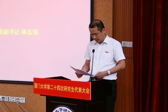 校党委副书记林东伟代表校党委在大会上讲话,他首先代表校党委对大会的召开表示祝贺,向全校广大研究生表示问候和祝愿。他在讲话中充分肯定了校第二十三届研究生会过去一年的工作,他希望全校广大研究生要牢记习近平总书记的嘱托与期望,按照“勤学、修德、明辨、笃实”的要求,坚定理想信念,锤炼高尚品格,勇于创新创造,在学习和工作中提高对自己的要求,人生的境界要更高一些,学习的标准要更高一些,作风的养成要更严一些。林东伟代表学校党委要求新一届研究生会要带头加强理论学习和自身建设,不断强化服务意识,创造性地开展工作,为实现我校“两个百年”奋斗目标和中华民族伟大复兴努力奋斗。林东伟指出,学校各级党组织、各职能部门、各级共青团组织,要重视研究生会的建设,加强对研究生会工作的关心和支持,关心爱护研究生干部的成长。