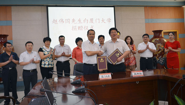 林东伟在捐赠仪式上说,赵伟国先生在事业成功的同时,不忘回馈社会,长期致力于支持文教等社会公益事业,今天,赵伟国先生的慷慨捐献,体现了一名优秀企业家的高尚品德和伟大博爱,也体现了赵先生对厦门大学的深厚情谊和无私奉献。厦门大学一定会按照赵伟国先生的心愿,用好每一笔捐款,争取最大的效益。全体师生员工也将把这份关爱化作学习工作中的动力。
