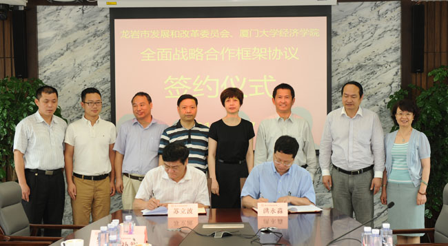5月27日上午,我校经济学院与龙岩市发改委在经济楼签署全面战略合作框架协议。经济学院、王亚南经济研究院院长洪永淼与龙岩发改委党组副书记、副主任、调研员(主持工作)苏立波代表双方签订协议。