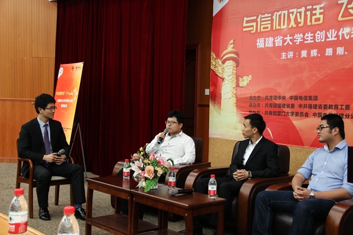 5月8日下午,由共青团中央和中国电信集团主办的“与信仰对话,飞Young中国梦”福建省大学生创业代表巡回报告会厦门大学专场在化学报告厅顺利举行。本次活动由共青团福建省委、中共福建省委教育工委、福建省教育厅、福建省学生联合会承办,共青团厦门大学委员会、中国电信福建分公司、三人行公司协办。