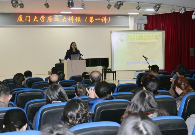 12月27日下午,由校纪委、监察处和法学院联合举办的厦门大学廉政大讲坛在艺术学院小音乐厅举行第一讲。法学院李兰英教授作《高校招生腐败的惩治与预防》讲座。校党委副书记、纪委书记、工会主席赖虹凯出席并讲话。
