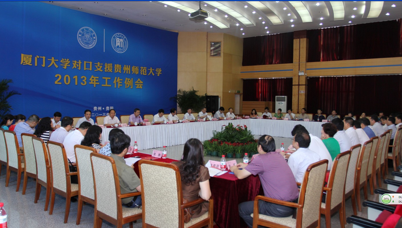 7月24日上午,厦门大学对口支援贵州师范大学2013年工作例会在贵州师范大学召开。我校校长朱崇实、副校长叶世满,贵州省教育厅党组成员、副厅长代其平,贵州师范大学校长伍鹏程,省政协副主席、副校长谢晓尧,校党委副书记邓惠宾、褚光荣,副校长刘肇军、蔡永生、吕国富出席会议。两校相关职能部门及学院的主要负责人参加。