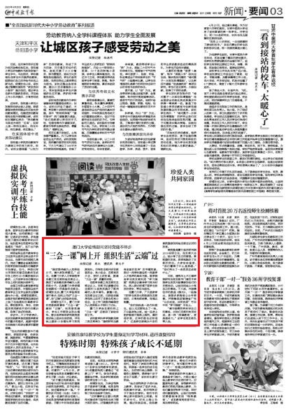 4月23日,《中国教育报》第三版刊发题为《厦门大学疫情期间坚持党建不停步 “三会一课”网上开 组织生活“云端”过》的报道,报道我校在疫情期间坚持党建不停步,在网上开好“三会一课”,在“云端”过好组织生活。