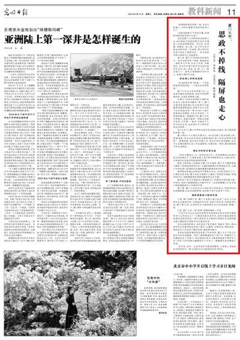 4月14日,《光明日报》第11版刊发《厦门大学:思政不掉线 隔屏也走心》深度通讯。通讯从“思政课上听阵地故事”“ 理论与科研互推互进”“ 微团课里接力脱贫攻坚”三个层次,报道我校把抗击疫情作为一场生动的思政大课堂。报道说,线上思政“金”课、云上“固定党日+”、战疫云团课随时可听可上,思想引领时时在线。