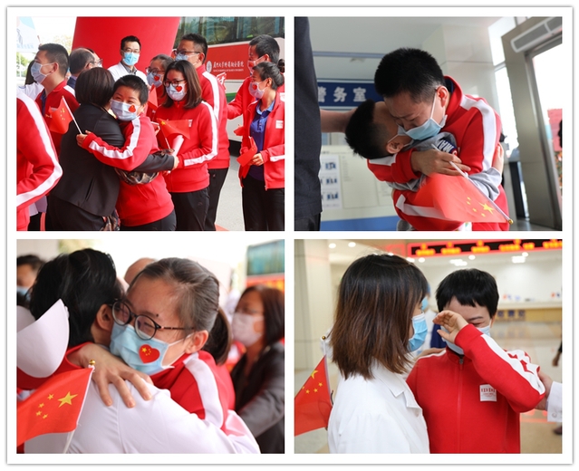 “欢迎回家!”“欢迎英雄归来!”下午2时许,带有“欢迎抗疫英雄凯旋”横幅的大巴车缓缓驶入医院,院领导、家属代表、各部门与科室代表早早列队,手拉横幅,高举照片、祝福标语夹道欢迎。援鄂队员们走下车,踏上红毯,穿过门诊楼外的凯旋拱门,与阔别的亲友同事一一问候拥抱,笑语与泪花交相,场面温馨感人。