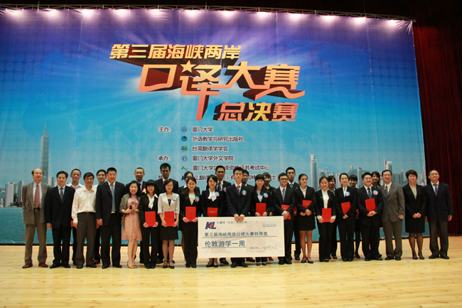 11月19日,由厦门大学、外语教学与研究出版社、台湾翻译学学会主办,厦门大学外文学院、厦门大学口笔译资格证书考试中心承办,KL翻译(北京)有限公司林超伦博士赞助的第三届海峡两岸口译大赛两岸总决赛在厦门大学科学艺术中心隆重举行。本次大赛共有169所高校的306名选手报名参加,最终,总决赛特等奖的桂冠由四川大学的费健博摘得,获得由英国外交部首席中文翻译林超伦博士全额资助的伦敦游学一周的机会。一等奖由辅仁大学的邱富泉、台湾师范大学的詹柏匀、外交学院的崔立获得,厦门大学的胡婷等6人获得二等奖;彰化师范大学的李绿台等10人获得三等奖,她们将获得由资助的台湾游学一周的机会。
