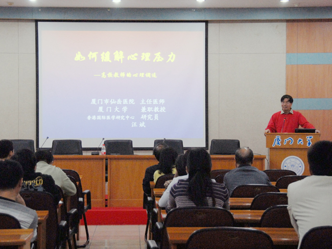 11月10日,首场由校工会主办、由厦门市仙岳医院副院长汪斌教授主讲的主题为《如何缓解心理压力-----高校教师的心理调试》的心理健康咨询讲座在嘉庚主楼220会议室开讲。校工会主席林永生主持讲座。