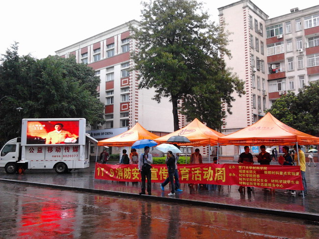 11月9日中午,三家村学生广场的一辆外观新颖的LED宣传车吸引了过往师生的注意力,纷纷驻足观看。来自材料学院的志愿者们一边热心地讲解消防宣传常识,一边向过往师生派发消防安全的宣传材料。虽然天空飘着小雨,但精彩纷呈的讲解和LED影像让热情的同学们流连忘返。该项活动由厦门大学材料学院、福建省防火阻燃材料重点实验室共同主办,由共青团厦门大学材料学院委员会承办,拉开了材料学院11•9消防安全宣传教育活动周系列活动的帷幕。