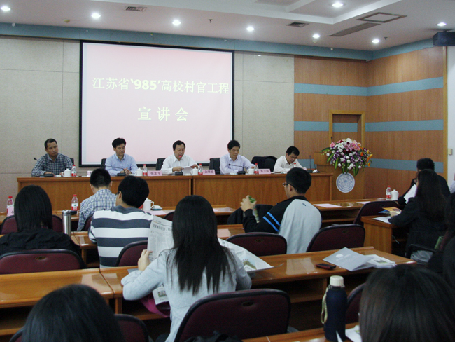 11月10日上午,江苏省“‘985’高校村官工程”宣讲会在颂恩楼220会议室举行。江苏省教育厅副厅长朱卫国做了情况介绍,我校党委常委、组织部长白锡能致辞。福建省教育厅高校学生处张龙飞、我校学生处处长林东伟等出席。