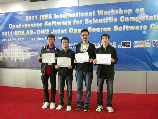 10月13日至10月15日,“2011 SCILAB-OW2 Joint Open Source Software Contest”暨“2011IEEE International Workshop on Open-source Software for Scientific Computation”在北京科技大学举行,由我校信息学院学生组成的四支参赛队伍在比赛再获佳绩,在三十几个参赛队中取得了两个二等奖,一个三等奖和一个优胜奖。
