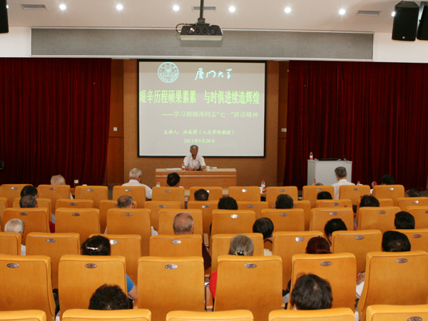9月28日上午,人文学院洪成得教授在化学报告厅以《艰辛历程硕果累累,与时俱进续造辉煌——学习胡锦涛同志“七一”讲话精神》为题,为我校离退休老同志做了一场专题辅导报告。