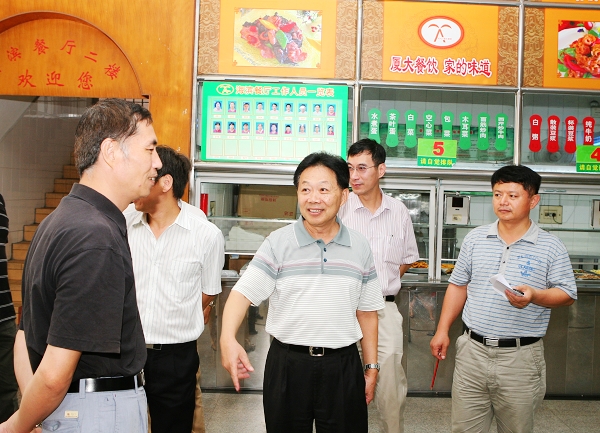 在海韵学生公寓,检查组重点检查了学生宿舍的防火、防盗情况。针对迎新期间人流车流量大,检查组强调要做好校园交通疏导工作,确保人流车流安全畅通。在化学化工学院药品室,检查人员详细了解各类危险药品的申购、领用以及存储情况,并进一步就加强药品安全监管、完善应急预案等提出意见和要求。在勤业餐厅,检查组与餐厅工作人员亲切交谈。在认真查看餐具的洗刷消毒、食品的清洗检测、用餐环境等方面情况后,检查组对工作人员的辛苦劳动表示感谢,希望他们能始终坚持服务师生的宗旨,强化服务意识,真正让师生吃得安心、吃得放心。