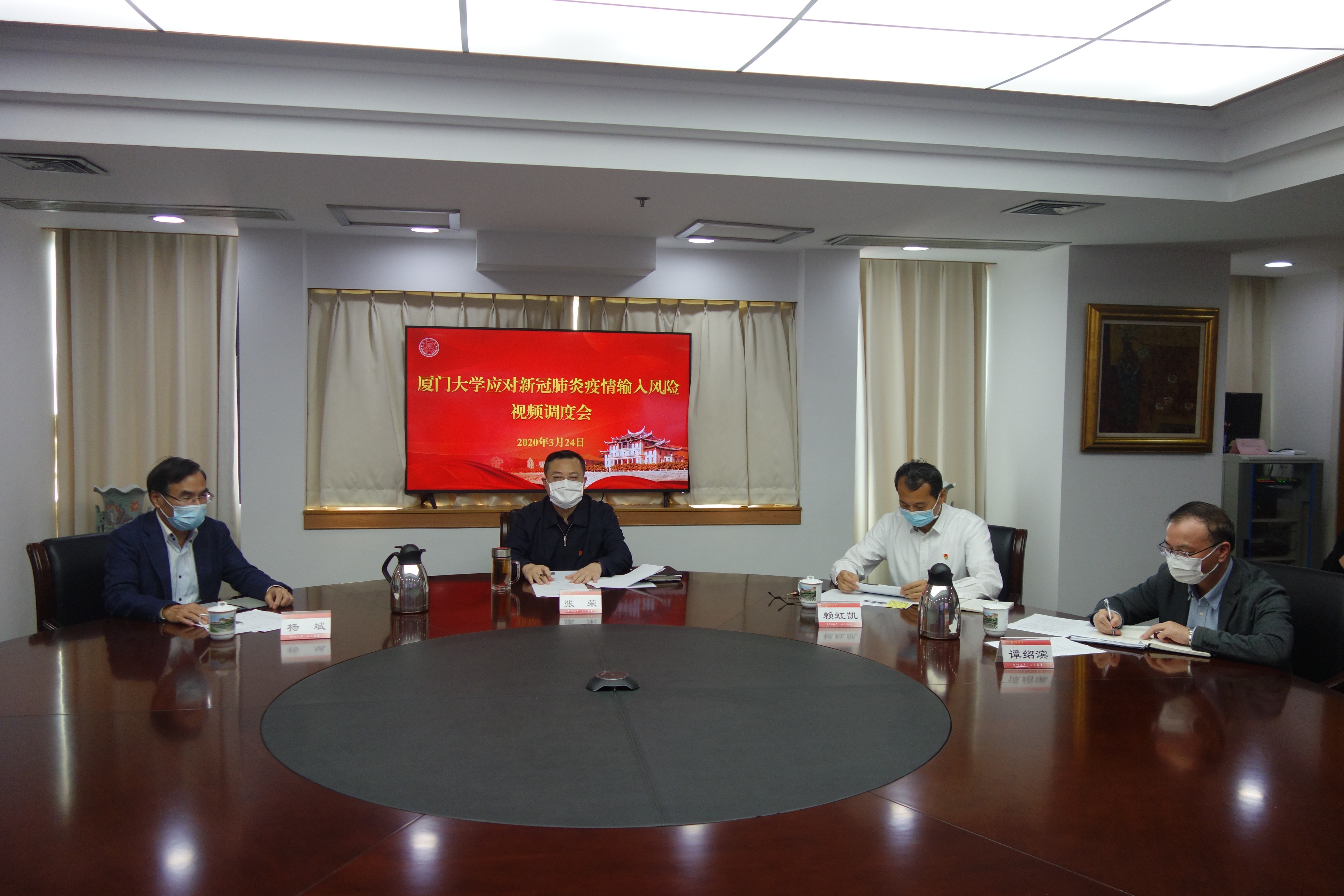 会上,校党委副书记赖虹凯传达学习习近平总书记在3月18日中央政治局常委会上的重要讲话精神、3月23日召开的中央应对新冠肺炎疫情工作领导小组会议精神,并根据教育部、福建省、厦门市的要求,布置我校应对新冠肺炎疫情输入风险,加强境外疫情输入防控工作。校长助理谭绍滨介绍我校外籍师生和目前在境外师生的基本情况,就加强疫情输入防控工作提出要求。通过现场线上调度,海外教育学院/国际学院、外文学院、经济学院、医学院、汉语国际推广南方基地/孔子学院办公室、马来西亚分校等单位分别汇报了各单位在境外师生的基本情况,境外疫情输入防控工作开展情况,以及下一步的工作思路。