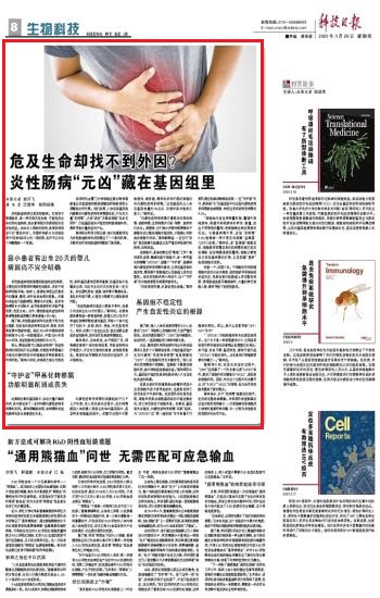 3月26日,《科技日报》第八版刊发《危及生命却找不到外因? 炎性肠病“元凶”藏在基因组里》深度报道,报道我校细胞应激生物学国家重点实验室莫玮教授课题组和韩家淮院士课题组研究成果发表于《自然》杂志,该研究发现,人体自身基因组内静默的内源性逆转录病毒激活后,产生的大量“类病毒”,大举“进攻”并激发细胞“自杀式保护”,引起基因组的不稳定性和肠细胞坏死,最终导致大量炎症的产生。这一最新研究为炎性肠道疾病的成因提出了一个新的机制,为靶向治疗炎性肠道疾病提供了新思路。