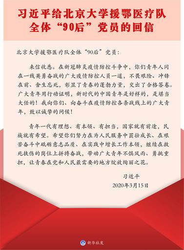 3月15日,习近平总书记给北京大学援鄂医疗队全体“90后”党员回信,向他们和奋斗在疫情防控各条战线上的广大青年致以诚挚的问候。